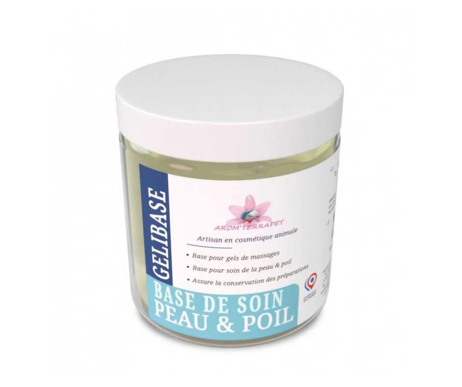 La Gelibase d’Arom’Terrapet est une base d’hygiène cosmétique naturelle, spécialement conçue pour créer des soins professionnels sur mesure. Elle permet de formuler facilement des gels de massage, enveloppements ou prémasques, en intégrant vos extraits végétaux et actifs fortifiants ou apaisants selon les besoins de chaque animal.